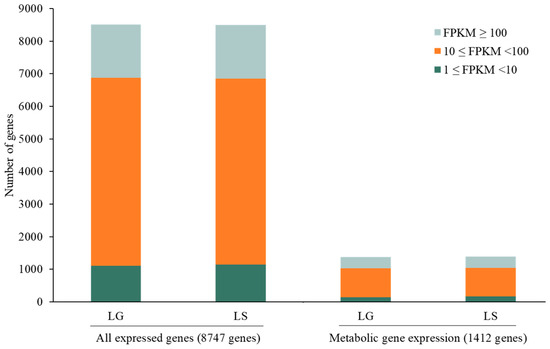 In detail, 93.62% and 94.17% of the 8747 genes were expressed in light–glucose (LG) and light–sucrose (LS) conditions, respectively. The expression levels of all genes and metabolic genes were classified into three categories. The majority of genes with FPKM values were 10 ≤ FPKM < 100, FPKM ≥ 100, and 1 ≤ FPKM < 10, respectively. The total expressed metabolic genes in each category are shown in Figure 4.