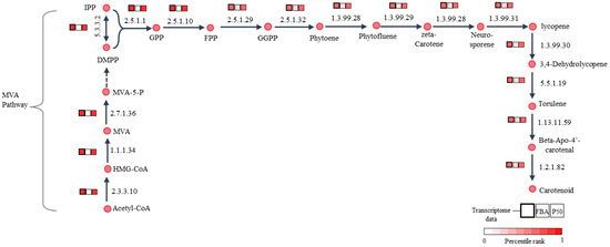Here, GIMME utilized 1412 expressed metabolic genes to inform the set of active reactions in the iPS1474 model by assuming that reactions were considered to be active when the expression of associated genes exceeded a certain threshold (50th percentile, P50) and minimized flux through inactive reactions. As a result, the GSMM with transcriptome-integrated constraints (tiGSMM) of C. militaris, namely, iPS1474-tiGSMM-P50, was gained using the GIMME approach. The simulation of iPS1474-tiGSMM-P50 under sucrose upon light exposure was assessed for its capability to predict flux distribution consistent with the transcriptome data of C. militaris (Supplementary File S2; Table S2). The iPS1474-tiGSMM-P50 showed flux distribution, which improved predicted flux through carotenoid biosynthesis via the mevalonate (MVA) pathway, as shown in Figure 5. It is suggested that the hydroxymethylglutaryl-CoA synthase (EC: 2.3.3.10) catalyzing 3-hydroxy-3-methylglutaryl-CoA (HMG-CoA) synthesis, hydroxymethylglutaryl-CoA reductase (EC:1.1.1.34) catalyzing mevalonate (MVA) synthesis, and mevalonate kinase (EC:2.7.1.36) catalyzing 5-Phosphomevalonate (MVA-5-P) synthesis as a substrate played crucial roles in the biosynthesis of carotenoid, as supported by Thananusak et al. (2020) [13]. Meanwhile, the iPS1474 model could not capture the MVA pathway (Figure 5). This finding clearly indicates that iPS1474-tiGSMM-P50 could improve the predicted metabolic flux distribution consistent with the light-exposed gene expression of C. militaris.