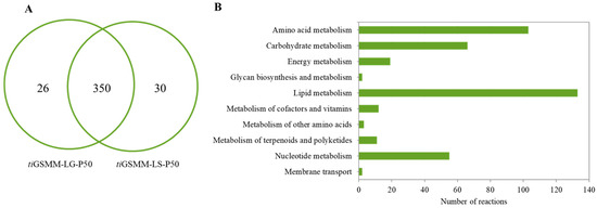 The number of the active metabolic reactions identified by the iPS1474-tiGSMM-P50 model prediction, (A) Venn diagram of the number of active reactions under glucose and sucrose upon light-exposure, i.e., tiGSMM-LG-P50 and tiGSMM-LS-P50, respectively, and (B) KEGG-based pathway classification of combination of all active reactions under light-exposure.