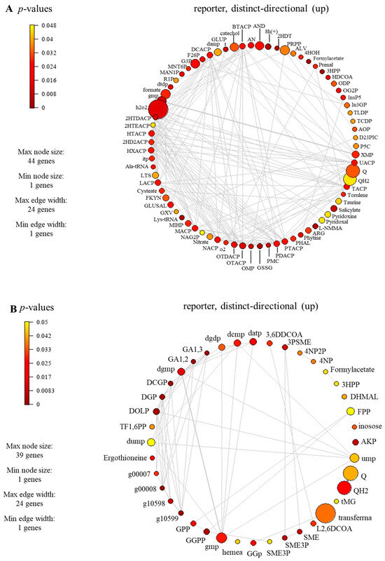 Subnetwork of reporter metabolites of C. militaris at different carbon sources under light exposure, (A) sucrose and (B) glucose. Full information of the subnetwork and full name of reporter metabolites can be seen in Supplementary File S4 (Tables S4 and S5).