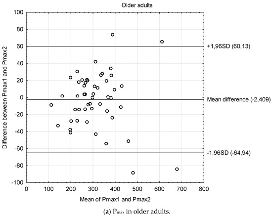 Power calculation was performed to estimate the required sample size. The sample size required to detect differences of 10% in muscle function variables (with 0.80 power, 0.05 alpha type I error rate and given baseline standard deviation values) was 26 and 27 for Pmax·kg−1 and υopt, respectively. Data were verified for normality of distribution (Shapiro–Wilk test) and equality of variances (Levene’s test) in each group. The results enabled the use of parametric tests. T-test for paired comparisons was used to compare mean differences between measurements (test1 vs. test2). Pearson’s correlation coefficients and Intraclass Correlations Coefficients (ICC) were calculated for repeated measurements. ICC (model 2,1) were interpreted as follows: values less than 0.5, between 0.5 and 0.75, between 0.75 and 0.9, and greater than 0.90 are indicative of poor, moderate, good, and excellent reliability, respectively. The standard error of measurement (SEM), representing the absolute reliability, was calculated as: SEM = standard deviation × √(1 − ICC). The coefficient of variation (CV or SEM%) was calculated as SEM divided by the mean and expressed in %. The minimal detectable change (MDC) (the minimum amount of change that can be interpreted as a real change) was calculated for the 95% confident interval (CI) as: MDC = SEM × 1.96 × √2. MDC% was calculated as MDC divided by the mean of the two tests and expressed in %. The agreement between the two measurements was graphically examined using the Bland–Altman approach: the difference between each pair of measurements was plotted against their mean. Heteroscedasticity was measured as correlation coefficients between mean differences and mean values of repetitive measurements. The results are presented as the mean ± standard deviation (SD). The level of significance was set at p < 0.05 for all the analyses. All statistical procedures were performed using the Statgraphics Plus 5 software package (Statpoint Technologies, Inc., The Plains, VA, USA) and Statistica 13.1 software package (StatSoft, Cracow, Poland).
