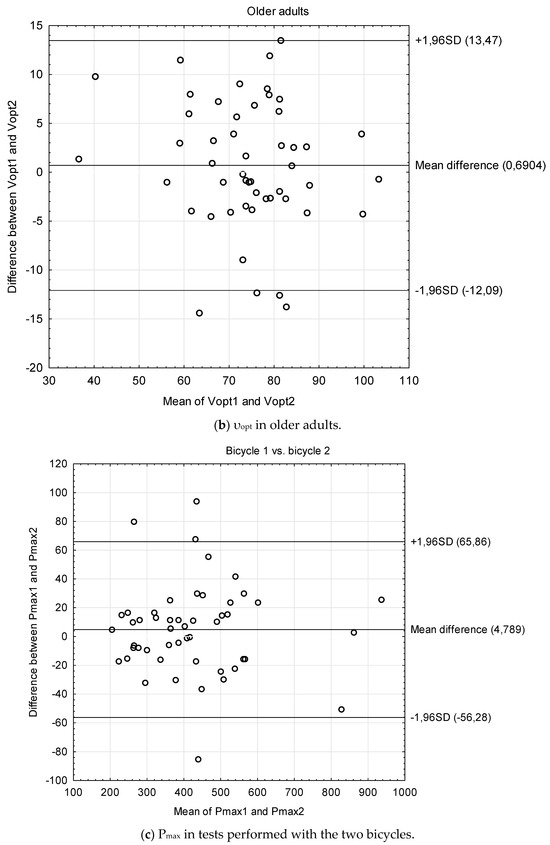 The Bland–Altman plots (Figure 1) graphically show the reliability patterns in terms of systematic errors and the limits of agreement between the repeated measures in older adults and tests performed with the two bicycles. The heteroscedasticity analysis showed no association between inter-trial mean differences and inter-trial averages (all the associations were statistically not significant) (Table 2).