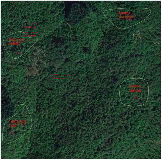 Aerial view of the four plots (Ribuio test, Ribuio control, Bandina test and Bandina control); the plots under investigation are delineated in green.