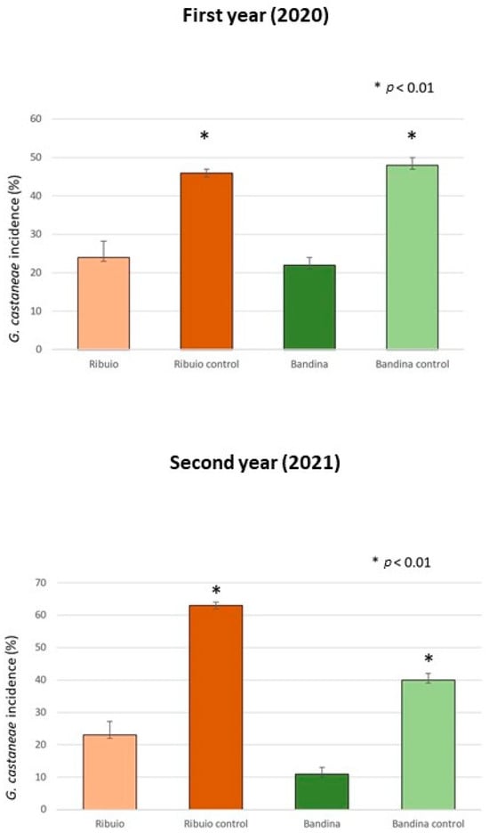 Average percentage of nut fruits found infected by G. castaneae in test plots at the “Ribuio” and “Bandina” chestnut groves and in their respective control plots. Black bars represent standard errors. * Significant differences between numbers of infected nuts found between localities (χ2, p < 0.01).