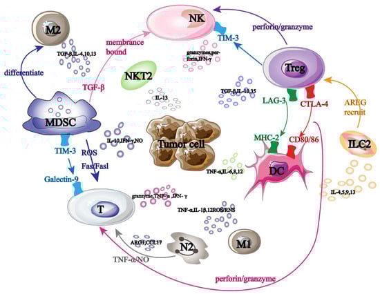 Tumor immunotherapy-related cells. Black large font: names of different tumor-related immune cells; Black font: names of immune factors secreted by tumor-related immune cells; Arrow: the interaction effect between immune cells; Same color font: immune cell surface receptors and ligands.
