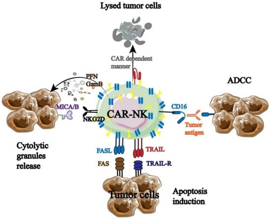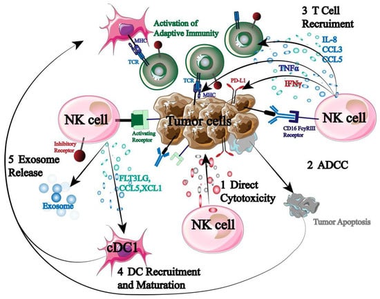 NK cells can directly cause autotoxicity by secreting granzyme and perforin. Second, NK cells express high levels of CD16 to initiate ADCC when they encounter a stimulatory signal that is greater than an inhibitory one. Furthermore, NK cells have the ability to release cytokines and chemokines that attract and assemble other immune cells (T cells, DC cells, etc.), initiating an adaptive immune response that destroys tumor cells [,,]. More significantly, previous sensitization and specific antigen presentation are not necessary for NK cell activation. As a result, NK cells have the ability to both trigger a systemic tumor immune response and specifically target tumor cells.