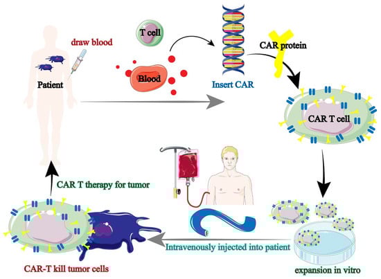 Tumor immunotherapy has been using CAR-T therapy more and more in recent years. Tumor immunotherapy is based on the augmentation of immune lymphocytes; however, the incidence of anti-tumor immune responses is strictly restricted due to the absence of endogenous T cells [,]. In order to express antigens that precisely target tumor cells, T lymphocytes from patients (autologous) or healthy people (allogeneic) were gathered and genetically modified. Ultimately, the patient receives the effectively altered T lymphocytes in order to produce immune responses specific to the tumor and eliminate the tumor cells. Chimeric antigen receptor (CAR) therapy is the collective term for this immune cell-based anti-tumor therapy (Figure 4) [].