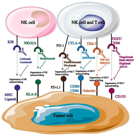 Monoclonal antibodies that are blocked by distinct targets are targeted at different types of tumors. For example, anti-PD-1 primarily targets cancers of the cervical, breast, liver, and lung tissues []; anti-NKG2A primarily affects natural killer cells in hematological malignant tumors []. According to reports, the use of monoclonal antibodies that obstruct PD-l/PD-L1 binding can greatly increase NK cells’ cytotoxicity and their ability to produce immunosuppressive cytokines, which in turn stunts the growth and spread of tumor cells. Many monoclonal antibodies that target PD-1 are currently being employed in clinical settings, and promising research outcomes have been attained. For instance, the receptor for PD-1 was overexpressed in tumor cells when it was first found on T lymphocytes. Consequently, PD-1 has a major impact on how NK cells respond immunologically to activators. Investigations centered around PD-1 can elucidate its possible function in NK cell immunosuppression and anti-tumor tactics aimed at reinstating NK cell toxicity [].