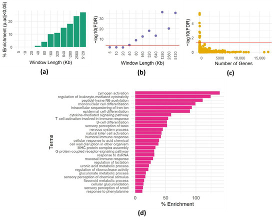 Impact of spatial dependencies on enrichment analysis. (a) Enrichment of the GO term “detection of stimulus involved in sensory perception of smell” (GO:0007608) in 400 randomly chosen genomic intervals of varying lengths. The y-axis shows the percentage of times the GO term was found to be enriched at a significance level of p < 0.0005 (equivalent to p < 0.05 with Bonferroni correction for 100 hypotheses) out of 100 repetitions. The x-axis shows the length of the genomic intervals in kilobases (Kb). (b) Minimum p-value for enrichment of the GO term “detection of stimulus involved in sensory perception of smell” (GO:0007608) in 400 randomly chosen genomic intervals of varying lengths. The y-axis shows the minimum adjusted p-value observed out of 100 repetitions. The x-axis shows the length of the genomic intervals in kilobases (Kb). The red line is at a significance level of adjusted p < 0.0005. (c) Enrichment results for one set of 400 randomly chosen genomic intervals of 500 Kb each. For each term, the -log FDR corrected p-value is plotted as a function of the size (number of genes) of the term. The red line is drawn at FDR = 0.05. (d) Heatmap showing the frequency of enrichment of GO terms in 400 randomly chosen genomic intervals of 500 Kb each. The y-axis shows the GO terms. The x-axis shows the percentages of enrichment of 100 repetitions (the full list is shown in Table S1).