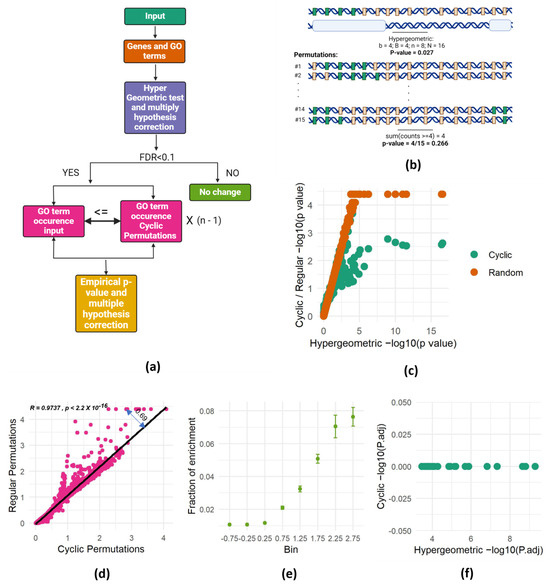 Our cyclic permutations-based approach has two main drawbacks worth noting. First, it is resource intensive as it involves calculating GO term enrichments for approximately 20,000 permutations. Secondly, its statistical power is limited due to the restricted number of cyclic permutations (n − 1, where n is the number of genes in the genome), resulting in a minimal p-value of 1/n − 1, which is equal to 5 × 10−5 for a typical mammalian genome with around 20,000 genes. These limited p-values can pose challenges, particularly when performing multiple hypothesis corrections.