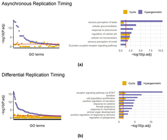 Applying SAGO to replication timing data. Left panels—dot plots showing adjust p-values of terms enriched in regions showing asynchronous replication (a) or differential replication timing between MEFs and primordial germ cells (b). For each term the cyclic permutation (yellow) and the naïve hypergeometric (blue) adjusted p-values are shown. The red line is drawn at an adjusted p-value = 0.05. Right panels—bar graphs comparing cyclic permutation and hypergeometric adjusted p-values for selected GO terms (the full list is shown in Table S2), for asynchronous replication regions (a) and differential regions (b). The red line is drawn at an adjusted p-value = 0.05.