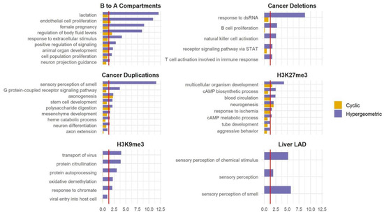 Applying SAGO to other datasets. Bar graphs comparing the cyclic permutation (yellow) and the hypergeometric (blu) corrected p-value for selected GO terms (the full list is shown in Table S2), for regions that changed from compartment B to A upon ES differentiation to NPC; regions deleted or duplicated in prostate cancer; large H3K27me3 and H3K9me3 ChIP-Seq domains in the liver tissue of a male adult and heart tissue embryo cells, respectively; and liver LAD. The red line is drawn at an adjusted p-value = 0.05.