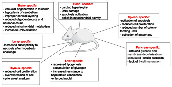 Summary of reported organ-specific effects of Trx system’s downregulation/knockouts in mice. This figure was partly generated using Servier Medical Art, provided by Servier, licensed under a Creative Commons Attribution 3.0 unported license (https://creativecommons.org/licenses/by/3.0/).