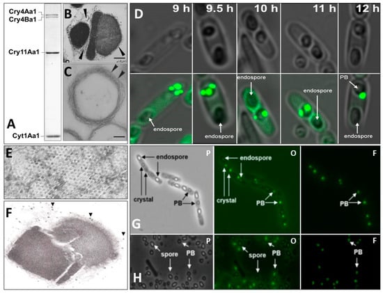 Structural features of Bacillus thuringiensis subsp. israelensis parasporal body (PB), a unique prokaryotic insect larvicidal organelle (PILO). Sodium dodecyl polyacrylamide gel electrophoresis protein profile showing that Cry4Aa1 (135 kDa), Cry4Ba1 (128 kDa), Cry11Aa1 (65 kDa), and Cyt1Aa1 (27 kDa) (A) are the major mosquito larvicidal proteins of the PILO (B). Note that crystals of Cry4Aa1/Cry4Ba1, Cry11Aa1, and Cyt1Aa1 are each enveloped by a multilamellar fibrous matrix (MFM; arrowheads) that is also found in the peripheral composite structure. Purified MFM derived from the PILO treated with alkaline to dissolve and remove the Cry and Cyt proteins; multiple layers of the MFM are observed (arrowheads) (C). Brightfield and corresponding fluorescence confocal microscopy showing the progressive formation of Bti’s PILO; GFP-labeled Bt0152, a pBtoxis-coded protein, known to specifically bind to the MFM [266], associates with this structure as early as 9 h, well before the three crystalline inclusions are observed at 12–20 h (D). Ultrastructural analysis of the MFM showing that it contains hexagonal pores (E) and discrete particles thought to be ribosomes (arrowheads) attached to the MFM (F), suggesting that the Cry and Cyt proteins are synthesized through the pores and are concentrated and crystallized in their respective compartment in the PILO. GFP-labeled Bt075, a protein also coded for by pBtoxis and which is structurally similar to phage capsid and encapsulin shell proteins, is also a PILO-specific component that associates with the MFM as early as 6 h before distinct crystals are observed; phase (p), phase-fluorescence overlay (o), and fluorescence (f) in sporulating cells at 20 h (G); and cells that have autolyzed at 48 (H) to release spores (s) and the PILO are shown. Bar (B,C,F) = 0.2 mm. (Adapted from Rudd et al. [127]).