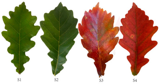 Q. mongolica phenotypes during the four developmental stages: young leaf stage (S1), green leaf stage (S2), colour change stage (S3), and red leaf stage (S4).