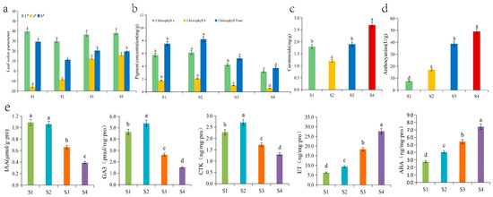 Changes in the (a) leaf colour parameters, (b) chlorophyll contents, (c) carotenoid content, (d) anthocyanin content, and (e) five hormone contents of Q. mongolica. Different lowercase letters indicate significant differences between the groups (p < 0.05).