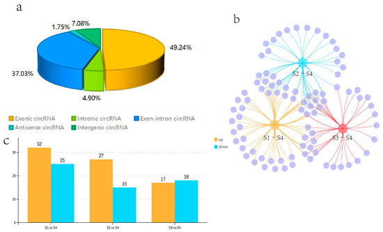 Statistical analysis of the identified circRNAs and the differentially expressed circRNAs (DECs) in S1, S2, S3, and S4. (a) The proportions of the various types of circular RNAs. (b) Venn diagram analysis of the DECs in S1–S4, S2–S4, and S3–S4. (c) The number of upregulated and downregulated DECs in each comparison.