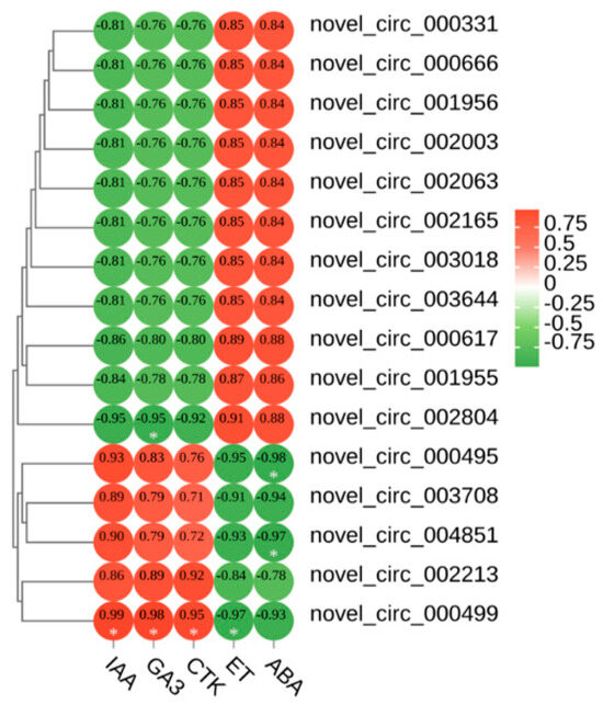 We correlated the leaf colour parameters, pigment content, and five phytohormones with the circRNAs (Supplementary Figure S2). The results showed that novel_ circ_ 004851, novel_ circ_ 003708, novel_ circ_ 000499, and novel circ_ 000495 were highly significantly negatively correlated with anthocyanins. Novel_ circ_ 002804 was highly significantly positively correlated with anthocyanins. We speculated that these five DECS are involved in the regulation of leaf colour in Q. mongolica. To investigate the effects of the five hormones on leaf colour, we conducted a correlation analysis between IAA, GA3, CTK, ET, ABA and 16 DECs. As a result, ABA and novel_ circ_ 004851 and novel_ circ_ 000495 were highly significantly negatively correlated. ET and novel_ circ_ 000499 were highly significantly negatively correlated. IAA, GA3 and CTK were highly significantly positively correlated with novel_ circ_ 000499. GA3 and novel_ circ_ 002804 were highly significantly negatively correlated (Figure 4).