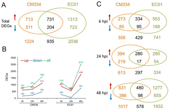 Differentially expressed genes (DEGs) identified in the pepper lines CM334 and EC01 against P. capsici infection. (A) In total, 2159 and 2971 DEGs were identified in CM334 and EC01 during P. capsici infection, respectively, and 935 DEGs overlapped between CM334 and EC01. (B) DEGs were identified in CM334 and EC01 at 6, 24 and 48 h after P. capsici inoculation, respectively. (C) Venn diagrams of DEGs identified from CM334 and EC01 at each time point after P. capsici inoculation, respectively. The upward arrows represent the significantly up-regulated genes, and the downward arrows represent the significantly down-regulated genes.