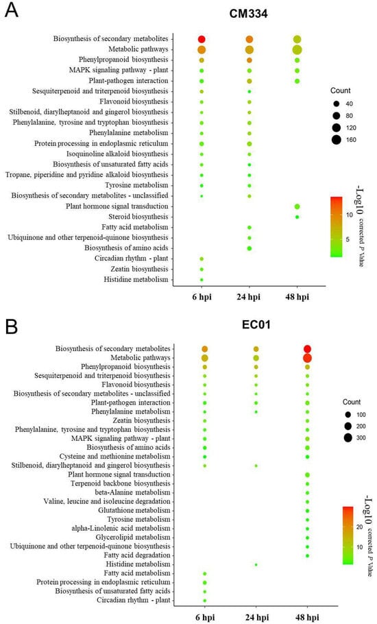 Kyoto Encyclopedia of Genes and Genomes (KEGG) pathway enrichment analysis of differentially expressed genes (DEGs) in pepper lines CM334 and EC01 against P. capsici infection. (A) KEGG pathway enrichment analysis of DEGs in CM334 at various time stages after P. capsici infection. (B) KEGG pathway enrichment analysis of DEGs in EC01 at the indicated time points after P. capsici infection. The size of the dot indicates the number of DEGs in the corresponding pathway.