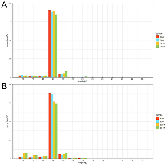 Length distribution of miRNAs in pepper at different time points after P. capsici inoculation. (A) Length distribution of miRNAs was obtained from CM334 at 0, 6, 24 and 48 h after P. capsici inoculation. (B) Length distribution of miRNAs was obtained from EC01 at the indicated time points after P. capsici inoculation. The x-axis shows the miRNA sequence sizes from 18 to 30 nt; the y-axis shows the percentage of miRNA for every given size.