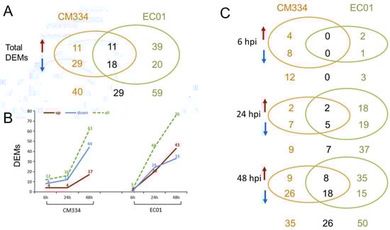 Differentially expressed miRNAs (DEMs) identified in the pepper lines CM334 and EC01 against P. capsici infection. (A) In total, 69 and 88 DEMs were identified in CM334 and EC01 during the P. capsici infection, respectively, and 29 DEMs overlapped in both lines. (B) DEMs were identified in CM334 and EC01 at 6, 24 and 48 h after P. capsici inoculation, respectively. (C) Venn diagrams of DEMs identified from CM334 and EC01 at each time point after P. capsici inoculation, respectively. The upward arrows represent the significantly up-regulated miRNAs, and the downward arrows represent the significantly down-regulated miRNAs.