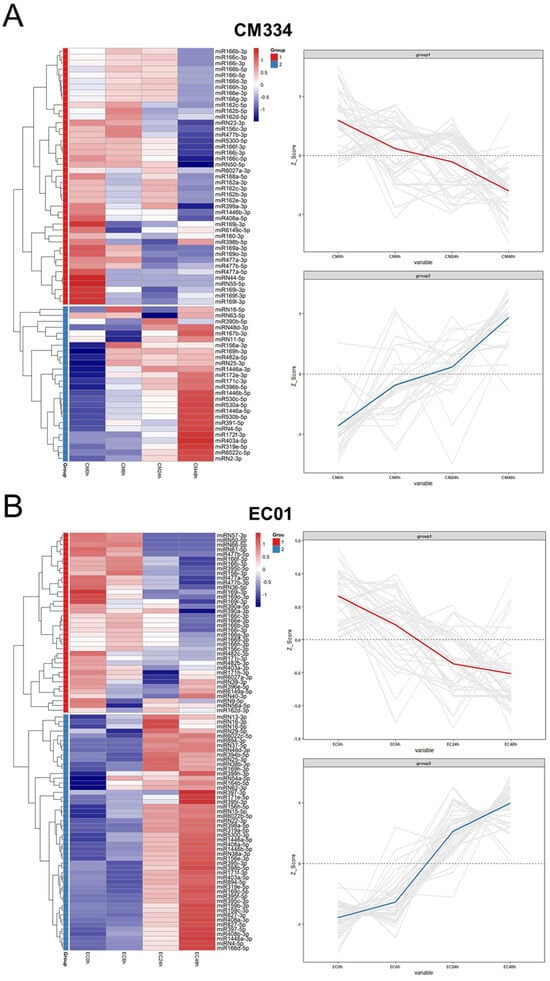 Expression profiles of differentially expressed miRNAs (DEMs) in the pepper lines CM334 and EC01 against P. capsici infection. (A) The transcriptional patterns of DEMs in CM334 at 0, 6, 24 and 48 h after P. capsici inoculation. (B) The transcriptional patterns of DEMs in EC01 at the indicated time points inoculated with P. capsici. The heat maps (left panel) of DEMs were constructed using the pheatmap package. The Z-scores of miRNA-seq data (right panel) were used for analysis of DEM expression trends using the ggplot2 package.