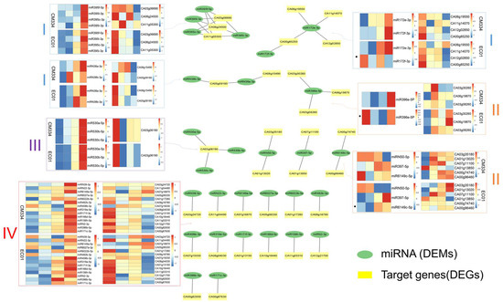 Regulatory networks of differentially expressed miRNAs (DEMs) and their differentially expressed target genes (DEGs) in pepper lines CM334 and EC01 against P. capsici infection. These 22 DEM-DEG regulatory networks can be divided into four groups. Samples in the heat maps from left to right are 0 hpi, 6 hpi, 24 hpi and 48hpi. Group I consists of DEM-DEG networks of multiple DEGs targeted by multiple DEMs, group II consists of multiple DEGs targeted by single DEMs, group III consists of multiple DEMs targeting single DEGs, and group IV consists of single DEMs targeting single DEGs.