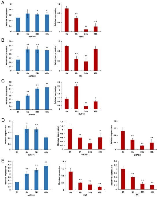 The qRT-PCR verification of five miRNAs and their target genes in pepper’s response against P. capsici infection. (A) miR166, (B) miR530, (C) miRN2, (D) miR171 and (E) miR395 and their target genes were selected for analyzing their expression patterns by qRT-PCR. STPK (serine/threonine protein kinase, CA10g16440); UN (unknown function protein, CA03g06190); RLP12 (receptor-like protein 12, CA12g21700); GRAS1 (GRAS family transcription factor, CA00g67630); GRAS2 (GRAS family transcription factor, CA01g13150); FAR (fusaric acid resistance protein, CA06g24500); SAT (sulfate adenylyltransferase, CA03g06690). Samples were collected from pepper line CM334 at 0, 6, 24 and 48 h after P. capsici inoculation. Each treatment was performed with three independent biological replicates. Asterisks indicate statistically significant differences as compared with mock-inoculated samples (0 hpi) using the least significant difference (LSD) test (* p < 0.05; ** p < 0.01).