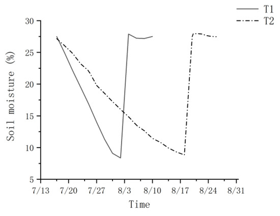 Soil water content changes under different drought treatments. T1 is the fast drought–rehydration group, and T2 is the slow drought–rehydration group.