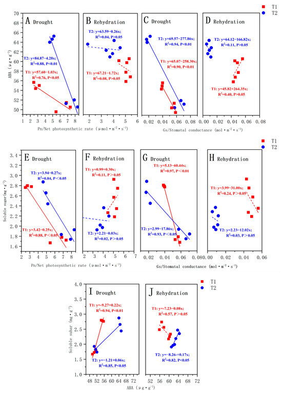 The relationship between the ABA content and net photosynthetic rate (Pn) during drought (A) and rehydration (B); The relationship between the ABA content and stomatal conductance (Gs) during drought (C) and rehydration (D); The relationship between the SS content and net photosynthetic rate (Pn) during drought (E) and rehydration (F); The relationship between the SS content and stomatal conductance (Gs) during drought (G) and rehydration (H); The relationship between the ABA content and SS content during drought (I) and rehydration (J). The solid lines identify significant correlations. The Pearson’s correlation coefficients (R2) and significance levels are shown. The explanations of T1 and T2 are shown in Figure 2.