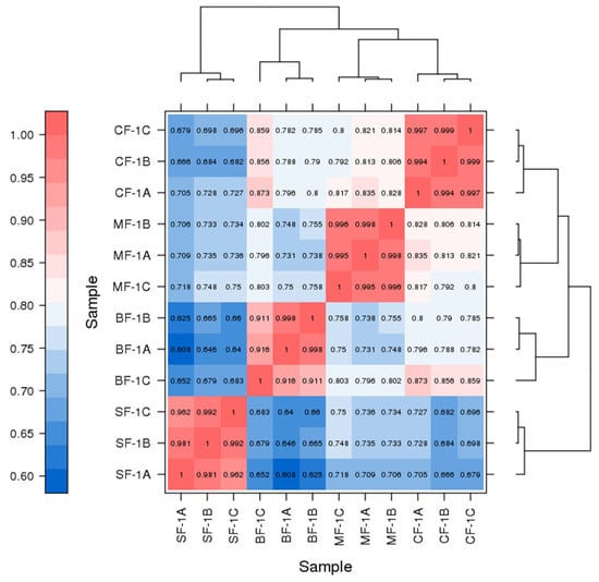 Correlation between the CMD samples obtained following waterlogging treatment. ABC indicates different replicates within the same group. The color of the box represents the degree of correlation, with dark red and dark blue representing the highest and the lowest degree of correlation.
