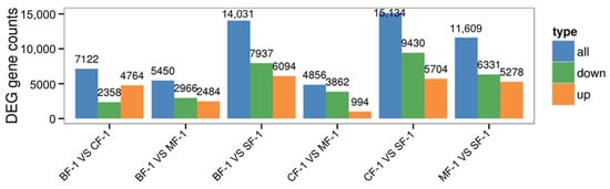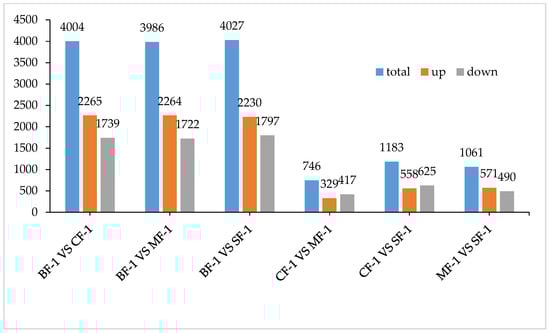 Three root samples were collected from each of the following groups: blanks, mild waterlogging (BF-1), moderate waterlogging (CF-1), and heavy waterlogging (SF-1) for transcriptome sequencing, yielding a total of 12 qualified libraries, from which clean reads were obtained by eliminating low-quality reads, resulting in approximately 76.25 Gb of clean data. The clean data of each sample exceeded 5.73 Gb, with Q30 bases accounting for over 91.21%. A total of 53,704 unigenes were obtained after assembly. The assessment of the gene expression level correlations among samples is important for verifying the reproducibility of biological experiments, evaluating the reliability of differentially expressed genes (DEGs), and identifying any outliers. In this study, Pearson’s correlation coefficient (PC) analysis was used to assess the correlations and reproducibility among the samples. As shown in Figure 1, duplicate samples exhibited significant clustering, indicating consistency among biological replicates and reliable sequencing results. Differential gene screening, based on the criteria of |Fold Change| ≥ 2 and FDR < 0.01, showed that the number of DEGs exceeded 11,000 between SF-1 and the other three groups, with a notable predominance of downregulated genes (Figure 2). In contrast, the number of DEGs between CF-1 and MF-1 was minimal, signifying minor gene expression variations between mild and moderate waterlogging conditions, aligning with the findings presented in Figure 1.