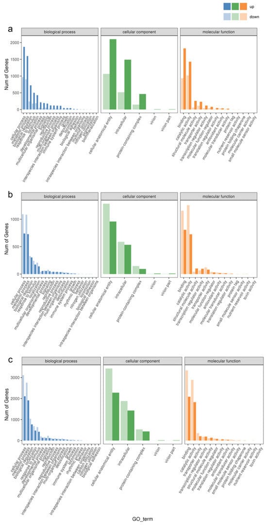 Enrichment of GO entries for DEGs. (a) Enrichment of DEGs for BF-1 vs. CF-1. (b) Enrichment of DEGs for BF-1 vs. MF-1. (c) Enrichment of DEGs for BF-1 vs. SF-1.