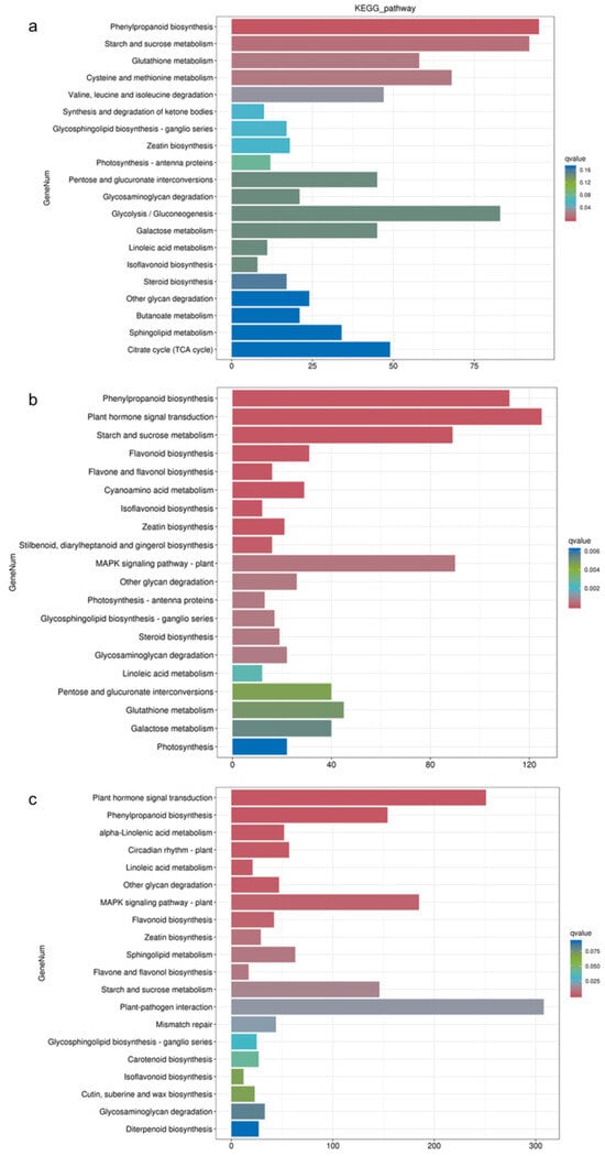 KEGG enrichment of DEGs. (a) Enrichment of DEGs for BF-1 vs. CF-1. (b) Enrichment of DEGs for BF-1 vs. MF-1. (c) Enrichment of DEGs in BF-1 vs. SF-1.