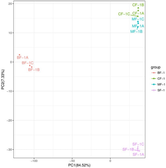 RNA isolation and library construction were performed according to the manufacturer’s protocols with the RNeasy Plant Mini Kit (Qiagen, Germany) and NEBNext®Ultra™ RNA Library Preparation Kit for Illumina® (NEB, Ipswich, MA, USA). The primer sequences (5′-3′): AGATCGGAAGAGCGTCGTGTAGGGAAAGAGTGT; AGATCGGAAGAGCACACGTCTGAACTCCAGTCAC were used. A cDNA library was constructed using CMD samples and sequenced in PE150 mode utilizing the Illumina NovaSeq6000 sequencing platform [19,20]. The raw sequencing data underwent a series of preprocessing steps that involved the removal of reads containing adapters, reads containing poly-N sequences, and low-quality reads. This preprocessing resulted in the generation of high-quality clean data. Transcriptome assembly was performed using Trinity [21], with default parameters except for the “min_kmer_cov” parameter, which was set to 2. Gene functions were annotated by referencing several databases including NR (NCBI non-redundant protein sequences) [22], Pfam (Protein family) [23], KOG/COG/eggNOG (Clusters of Orthologous Groups of proteins) [24], Swiss-Prot (a manually annotated and reviewed protein sequence database) [25], KEGG (Kyoto Encyclopedia of Genes and Genomes) [26], and GO (Gene Ontology) [27]. Intergroup DEGs were analyzed for BF-1, CF-1, MF-1, and SF-1 using the DESeq R package (1.10.1) [28], and DEGs were functionally clustered via the KEGG pathway and GO [29].