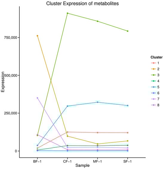 The 5151 DAMs were categorized into eight clusters based on their abundance and variance (Figure 7). Notably, the contents of metabolites in cluster 1, cluster 3, cluster 4, and cluster 5 increased after waterlogging, while the contents of metabolites in clusters 2, 7, and 8 decreased, and that of cluster 6 remained relatively stable. Cluster 3, encompassing four metabolites, and cluster 5, comprising 21 metabolites, displayed significantly higher levels of metabolites such as homoharringtonine, apiin, pelargonin, and chelidonic acid in the flooded group compared to the blank group (Table 2). Collectively, our findings suggest that these compounds may constitute the material basis for the adaptation of CMD following submersion due to waterlogging stress.