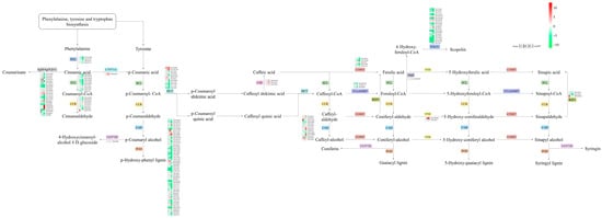 Phenylalanine and tyrosine play vital roles in the waterlogging tolerance of CMD. After exposure to waterlogging, the phenylpropanoid biosynthesis pathway of CMD exhibited a response involving 20 key enzymes and 36 metabolites (Figure 8). Notably, the expression levels of enzymes such as PAL, 4CL, and CCR decreased proportionally with the severity of waterlogging. CMD’s strategy for coping with waterlogging stress was found to primarily involve reducing phenylalanine and tyrosine metabolism while increasing their accumulation.