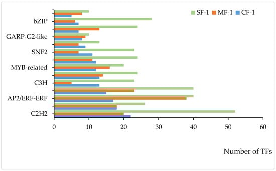 Multiple transcription factors (TFs) played a significant role in regulating the tolerance of CMD to waterlogging. As shown in Figure 9, 14 of the top 20 ranked differential TFs between the treatment and blank groups were common across all three waterlogging treatment groups, representing a 70% overlap. Among these, the top five TFs included C2H2, AP2/ERF-ERF, bHLH, and NAC, with four of them being shared. Together, these four TFs accounted for 34.6% to 43.4% of the total among the top 20 TFs, highlighting their pivotal role in regulating CMD’s waterlogging tolerance.