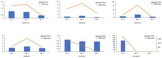 To validate the accuracy of the DEGs, six key DEGs (DN2723101, DN914502, DN3612101, DN496621, DN122401, and DN1086201) involved in phenylalanine and tyrosine metabolism were selected for qRT-PCR validation. The results demonstrated that the expression trend of the six selected genes in each sample was consistent with the RNA-Seq expression levels, which highly confirmed the reliability and credibility of the RNA-Seq results (Figure 10).