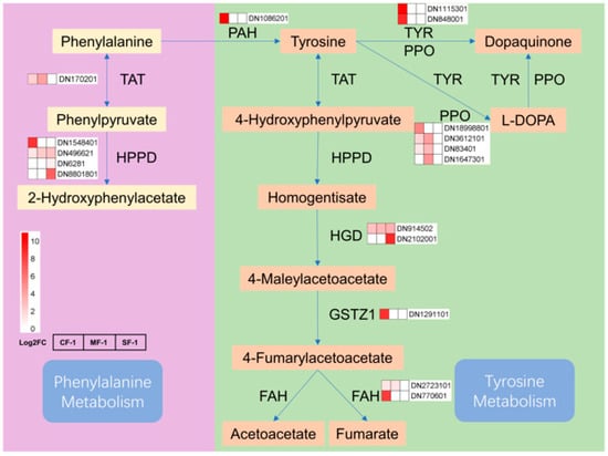 Phenylalanine and tyrosine metabolism in waterlogged CMD. The relative transcript levels of the enzyme are represented using a heat map. TAT: tyrosine aminotransferase; HPPD: 4-hydroxyphenylpyruvate dioxygenase; PAH: phenylalanine-4-hydroxylase; TYR: tyrosinase; PPO: polyphenol oxidase; HGD: homogentisate 1,2-dioxygenase; GSTZ1: maleylacetoacetate isomerase; FAH: fumarylacetoacetase.