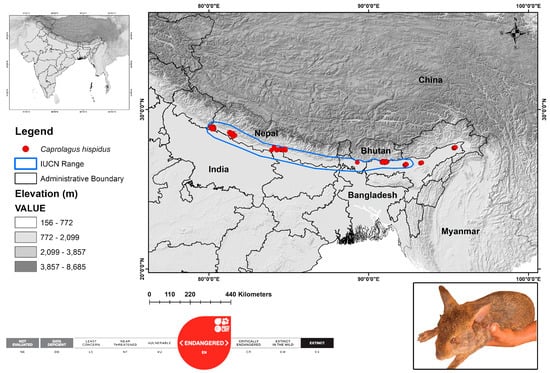 Historically, the hispid hare inhabited the southern foothills of the Himalayas, ranging from Uttar Pradesh to Assam in India and Nepal. Currently, the hispid hare’s distribution in southern Asia is patchy, encompassing Nepal, Bhutan, Bangladesh, and India, with elevations typically ranging from 100 to 250 m [5,11,17]. Thus, for the present study, the geographical range was considered as the study area that encompasses the historical range as well as the range assessed by the IUCN Red List specialist group (Figure 1). This scientific study utilized data from secondary sources from the platform Geospatial Conservation Assessment Tool (GeoCat) accessed on 15 February 2024 [41], which synchronizes with GBIF (n = 66) [42] and iNaturalist (n = 6) (https://www.inaturalist.org/) along with information extracted from peer-reviewed scientific literature (n = 30) [5,6,10,11,14,17,18,23,25,41,43]. A total of 102 identified locations of the targeted species were accumulated for the study.