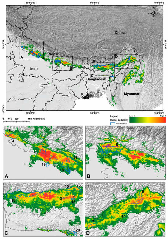 Map representing the present suitable habitat for hispid hare, C. hispidus in the distribution range and protected areas. The subfigures (A–D) illustrate the partial enlargements of above map, intended to demonstrate the habitat quality of the Protected Areas (PAs). 1. Shuklaphanta National Park, 2. Dibru-Saikhowa National Park, 3. Orang National Park, 4. Corbett National Park, 5. D’Ering Memorial Wildlife Sanctuary, 6. Dudhwa National Park, 7. Kaziranga National Park, 8. Chitawan National Park, 9. Burachapori Wildlife Sanctuary, 10. Sonanandi Wildlife Sanctuary, 11. Bardia National Park, 12. Nameri National Park, 13. Laokhowa Wildlife Sanctuary, 14. Pani-Dihing Wildlife Sanctuary, 15. Sonai-Rupai Wildlife Sanctuary, 16. Manas Tiger Reserve, 17. Valmiki National Park, 18. Katerniaghat Wildlife Sanctuary, 19. Kishanpur Wildlife Sanctuary, and 20. Borail Wildlife Sanctuary.