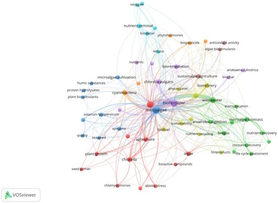 Co-occurrence network of keywords in publications on biofertilizers and biostimulants from microalgae. Eight theme groups: yellow, blue, green, purple, light purple, red, dark red, orange, and sky blue.