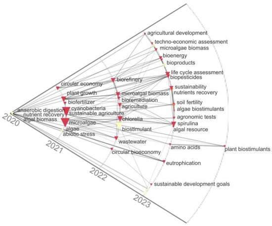 Additionally, the historical map was developed in the period 2020–2023 and showed the relationships between the most important keywords according to the co-occurrence measures of scientific publications on biofertilizers and biostimulants based on microalgae (Figure 3). This analysis reaffirmed the trends observed in the co-occurrence map and the Sankey diagram; for example, for the year 2021, keywords such as sustainable agriculture, biofertilizer, cyanobacteria, and circular economy, among others, were identified, while for the years 2022 and 2023, the keywords found were algae biostimulants, sustainability, Spirulina, Chlorella, biorefinery, wastewater, and microalgae biomass, among others. Also, it was possible to identify from the trends shown by the keywords that, in the context of the circular economy, the production of microalgae can contribute on different fronts, including their use as a biofertilizer or biostimulant, as well as the recovery of nutrients through the use of alternative and cheaper means such as wastewater or chemical fertilizers. Therefore, the use of sustainable sources of nutrients in agriculture, such as microalgae biomass, improves sustainability and promotes the circular economy [15,20,27].