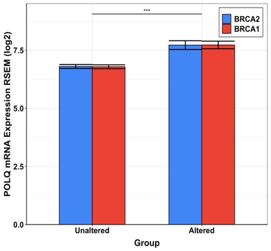 Expression of POLQ in normal cells and the cells containing altered (or mutant) BRCA1/2. This figure shows the difference in POLQ expression between normal cells and cells with BRCA mutations. Statistically significant higher POLQ expression is noted in normal cells compared to BRCA mutant cells. *** Based on a statistical T-test, the difference in POLQ mRNA expression between the two groups, unaltered BRCA and altered BRCA, is statistically significant (p < 0.001). Data used to generate this figure were obtained from CBioPortal [48].