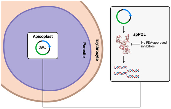 Enzyme apPOL as an antimalaria target. The apicoplast is an essential organelle in parasites with a genome of ~35 kb. This genome is copied by a replication machinery that requires apPOL. Thus, the inhibition of apPOL is expected to suppress the replication of the apicoplast genome. Currently, there are no approved inhibitors of apPOL. PDB file 7SXQ [28] was used to generate the ribbon diagram of apPOL.