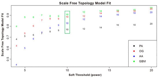 The microarray gene expression datasets were sourced from the National Center for Biotechnology Information: Gene Expression Omnibus (NCBI GEO) [https://www.ncbi.nlm.nih.gov/geo/ accessed on 7 December 2023] online database for WGCNA analysis. The datasets gathered contained expression data taken from primary tumor samples of patients diagnosed with pilocytic astrocytoma (PA), oligodendroglioma (OG), anaplastic astrocytoma (AA), and glioblastoma multiforme (GBM). Furthermore, only the datasets carried out through GPL570-HG-U133 Plus 2 Affymetrix Human Genome U133 Plus 2.0 Array were selected in order to prevent inconsistencies arising from probe design, normalization issues, and batch effects [,,]. This initial screening resulted in the exclusion of datasets for diffuse astrocytoma (DA) and anaplastic oligodendroglioma (AO) from further investigation. A total of 113 samples were obtained. Table 1 summarizes the details and distribution of samples for the four tumor types.