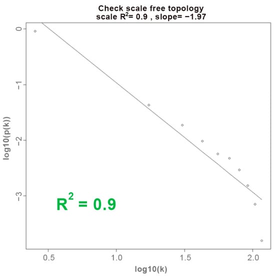 Using the pickSoftThreshold function of the WGCNA R package, a plot of the scale-free topology fit versus power index (1–20) was generated. The soft-thresholding power (β) was then selected as the lowest power for which the scale-free topology criterion is satisfied. In a scale-free topology, the distribution of gene degrees (number of gene connections) follows the power-law distribution. This is often evaluated based on how well the co-expression network conforms to the linear relationship between log of connectivity and log of connectivity probability—by plotting the scale-free topology fit versus soft-thresholding power and selecting the power at which the scale-free topology fit reaches a plateau or a reasonably high value that indicates a good fit []. Hence, an approximate straight-line relationship was plotted using the values for soft connectivity (k) to evaluate the chosen soft-thresholding power.