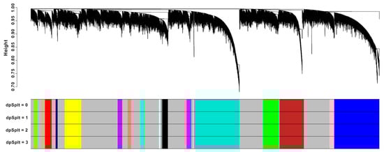 Using Pearson’s correlation with the network type “signed,” the adjacency matrices were generated for network construction. The Topological Overlap Measure (TOM) dissimilarities were then calculated using the soft-thresholding power to raise the adjacency matrices. This allowed the emphasis of the strong correlations and the downweighting of weak correlations in performing fast hierarchal clustering of genes using the flashClust function. To produce gene dendrograms using the highly correlated genes, the hclust function was used to perform hierarchal clustering based on the distance matrix of the expression profiles with the “average” method. Gene modules were identified based on hierarchal clustering through the cutreeHybrid function, in which the deep split parameter was tested from 0 to 3 for branch splitting sensitivity []. Stable modules that remain consistent across different values of a deep split parameter indicate that the clustering algorithm has accurately identified significant clusters within the datasets, while varying results would suggest additional validation of the parameters used, such as the soft-thresholding power.